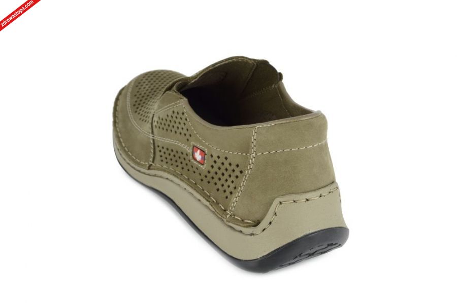 Dodatkowe informacje: obuwie męskie skórzane, wsuwane, dwie gumki po bokach dopasowują się do wysokości podbicia, bardzo miękka skórzana wkładka, perforowane (dziurkowane).
