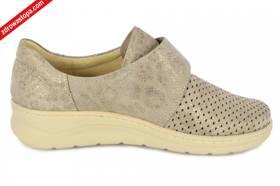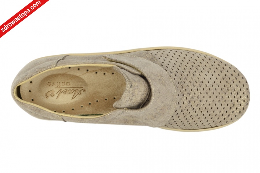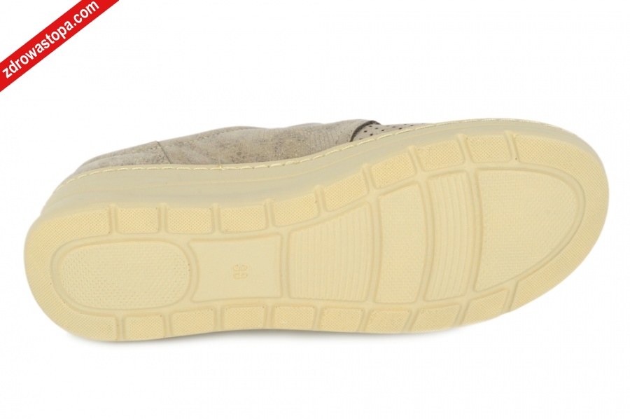 Dodatkowe informacje: Obuwie bardzo miękkie i elastyczne. Przednia część perforowana poprawia wentylację wnętrza obuwia. Spód szeroki antypoślizgowy. Obuwie zapinane na rzepę dobrze dopasowuje się do stopy. Wyjmowana profilowana wkładka którą można zastąpić na swoją.