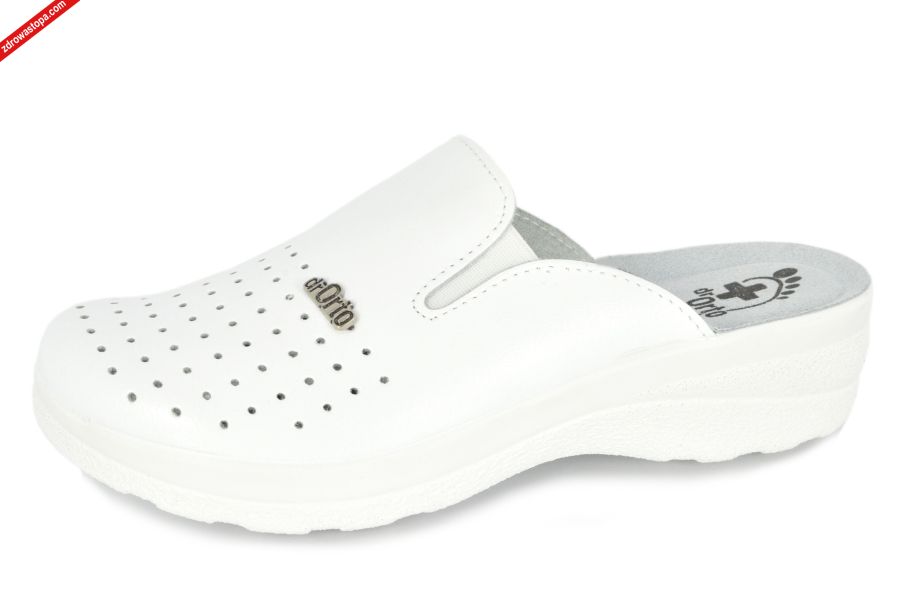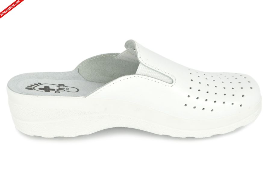 Dodatkowe informacje: klapki damskie z gumkami na podbiciu dopasowujące się do stopy, zakryte palce, dzięki skórzanej wkładce i dziurkom w przedniej części stopa się nie poci, wysokość klinu: 30 mm