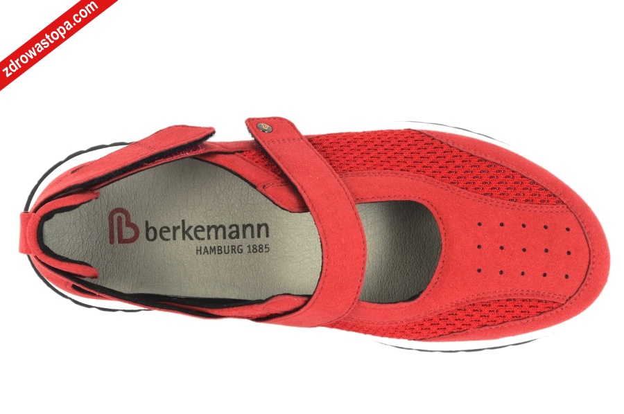 Dodatkowe informacje: Jest to obuwie niemieckiej firmy BERKEMANN istniejącej od 1885 roku. Posiadają bardzo dobrze wyprofilowane wkładki wymienne. Ponadto posiadają punkty na piętach amortyzujące mikrowstrząsy. Wyścielone skórą garbowania roślinnego. Rozciągliwy materiał tekstylny zapewnia idealne dopasowanie do stopy bez ucisku wrażliwych miejsc. Obuwie dobrze trzyma się na nodze i zapewnia najwyższy komfort noszenia. Dzięki wyjmowanej wkładce można stosować zamiennie wkładki ortopedyczne. Podeszwa lekka elastyczna nie ślizgająca się.