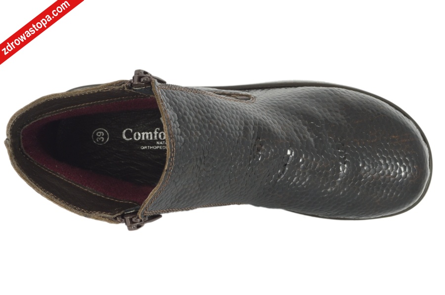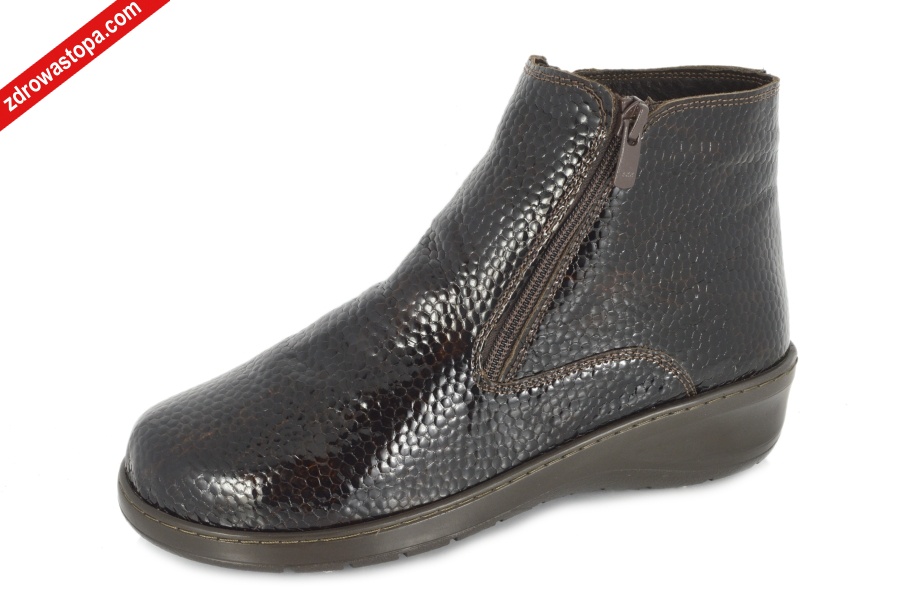 Dodatkowe informacje: Nowoczesny fason, dwa suwaki ułatwiające zakładanie. Wykonane z miękkiej skóry. Elastyczne i antypoślizgowe spody absorbujące drgania, koturn wysokości 40mm. Wnętrze butów wykończone miękkim materiałem, wyjmowana profilowana, skórzana wkładka.