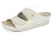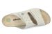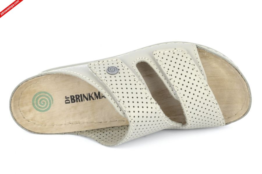 Dodatkowe informacje: wyprofilowane klapki damskie, skórzane, z punktem na pięcie amortyzującym drgania, dwa regulowane rzepy, w kolorze jasno beżowym