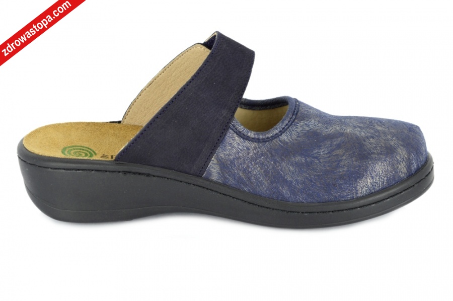 Dodatkowe informacje: wysokość klinu: 35 mm, zapięcie na rzepe na podbiciu. Skórzana, wyjmowana wkładka profilowana z punktem na pięcie amortyzującym drgania. Przednia część wykonana z tkaniny streczowej w celu wymiękczenia na ewentualnych haluksach.