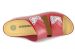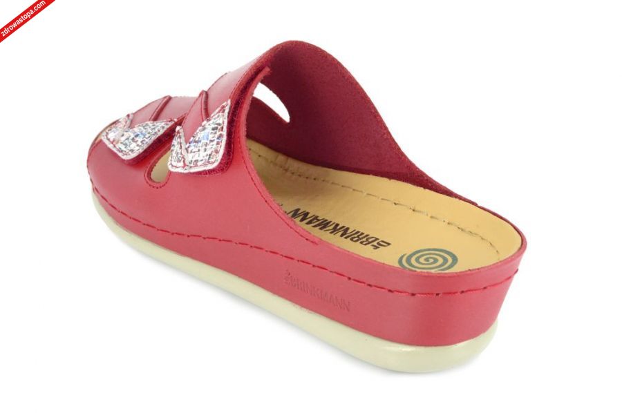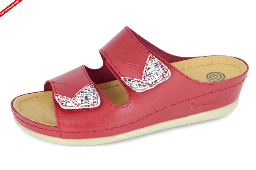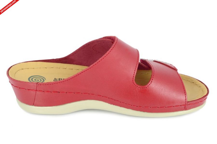 Dodatkowe informacje: wyprofilowane klapki damskie, skórzane, z punktem na pięcie amortyzującym drgania, zapinane na dwie rzepy.
