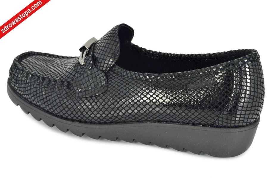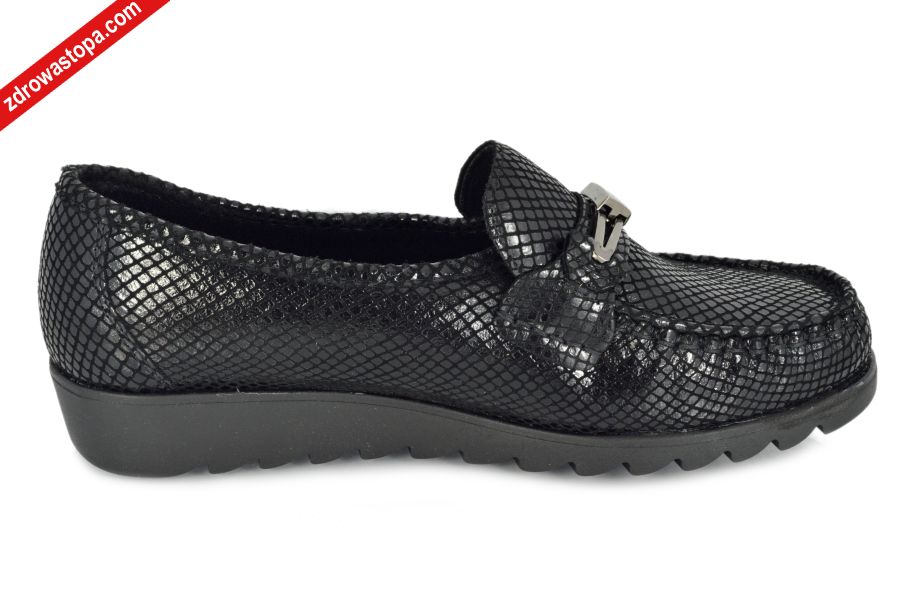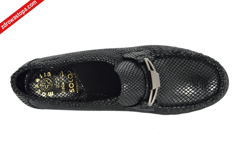 Dodatkowe informacje: klasyczny półbut skórzany firmy SOLO, bardzo miękka skóra w kolorze czarnym o podwyższonej tęgości H, wsuwane, wysokość klinu 30 mm. Wkładki pokryte płynem dezynfekującym z dodatkiem srebra koloidalnego, eliminuje bakterie, wirusy i grzyby. Lekkie i elastyczne spody