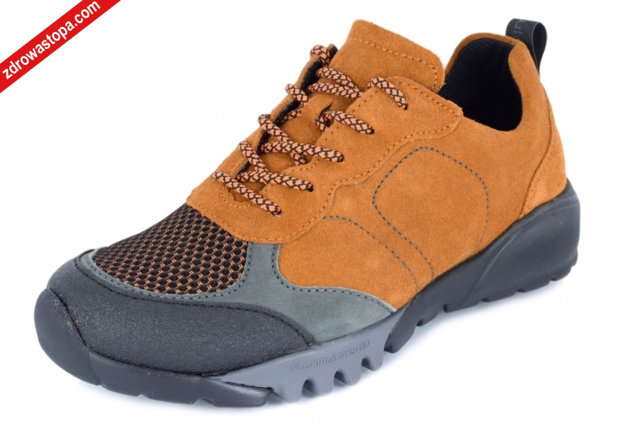 Dodatkowe informacje: Obuwie sznurowane. Półbuty są lekkie, siateczka w przedniej części dobrze wentyluje wnętrze obuwia idealne na długie wędrówki czy spacery. Spód traperowy, elastyczny, antypoślizgowy. Wnętrze miękkie, wyprofilowana wyjmowana wkładka.