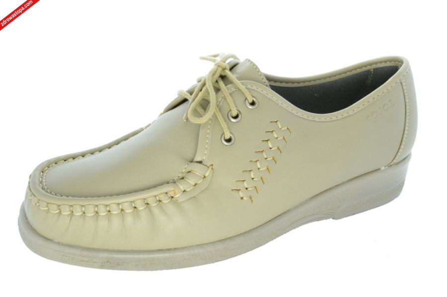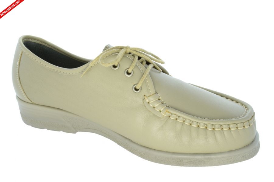 Dodatkowe informacje: klasyczny półbut skórzany firmy SOLO, bardzo miękka skóra w kolorze beżowym o podwyższonej tęgości H, regulowany na sznurówkę, wysokość klinu 30 mm,