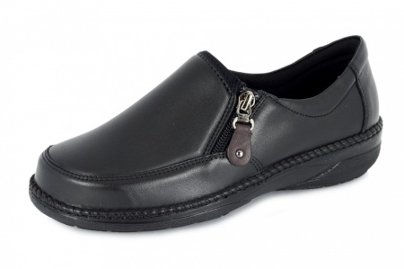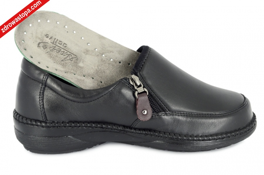 Dodatkowe informacje: Obuwie wsuwane wykonane z miękkiej skóry naturalnej lico, przednia część strechowa dopasowuję się do stopy dwa suwaki ułatwiają zakładanie osobom z wysokim podbiciem. Spód szeroki antypoślizgowy. Wyjmowana profilowana wkładka którą można zastąpić na swoją.