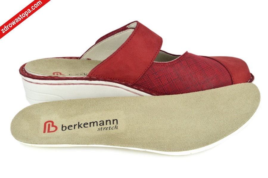 Dodatkowe informacje:Jest to obuwie niemieckiej firmy BERKEMANN istniejącej od 1885 roku z linii BERKOFLEX. Posiadają bardzo dobrze wyprofilowane wkładki wymienne przystosowane do prania. Ponadto posiadają punkty na piętach amortyzujące mikrowstrząsy. Wyścielone skórą garbowania roślinnego. Oryginalna pięciofazowa wkładka w podeszwie wewnętrznej oraz zapięcie na rzepę zapewnia dobrą regulację. Sprawiają, że obuwie dobrze trzyma się na nodze i zapewnia najwyższy komfort noszenia. Dzięki wyjmowanej wkładce można stosować zamiennie wkładki ortopedyczne. Podeszwa lekka elastyczna nie ślizgająca się. Materiał wierzchni ze skóry nubukowej ze specjalnym elastycznym bardzo miękkim materiałem obuwniczym na wysokości haluksa (stretch). Co powoduję komfort chodzenia nawet przy dużych haluksach.