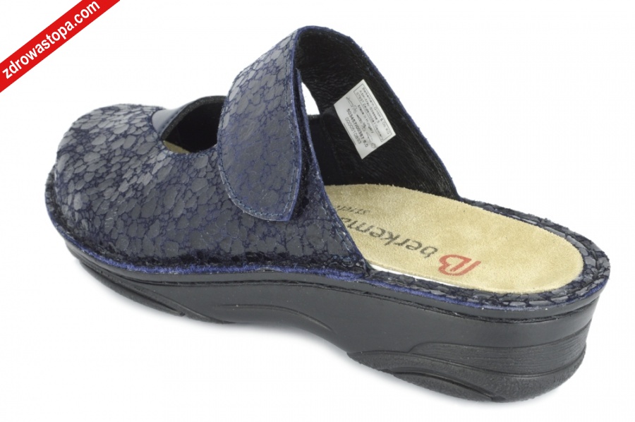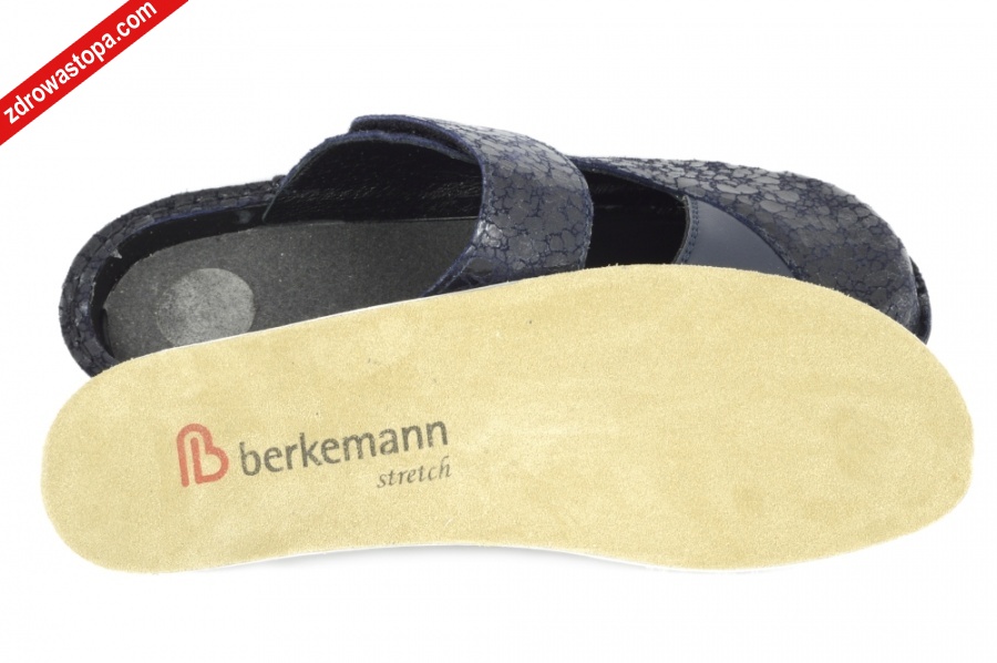 Dodatkowe informacje: Jest to obuwie niemieckiej firmy BERKEMANN istniejącej od 1885 roku z linii BERKOFLEX. Posiadają bardzo dobrze wyprofilowane wkładki wymienne przystosowane do prania. Ponadto posiadają punkty na piętach amortyzujące mikro wstrząsy. Wyścielone skórą garbowania roślinnego. Oryginalna pięciofazowa wkładka w podeszwie wewnętrznej oraz zapięcie na rzepę zapewnia dobrą regulację. Sprawiają, że obuwie dobrze trzyma się na nodze i zapewnia najwyższy komfort noszenia. Dzięki wyjmowanej wkładce można stosować zamiennie wkładki ortopedyczne. Podeszwa lekka elastyczna nie ślizgająca się. Materiał wierzchni ze skóry nubukowej ze specjalnym elastycznym bardzo miękkim materiałem obuwniczym na wysokości haluksa (stretch). Co powoduję komfort chodzenia nawet przy dużych haluksach.