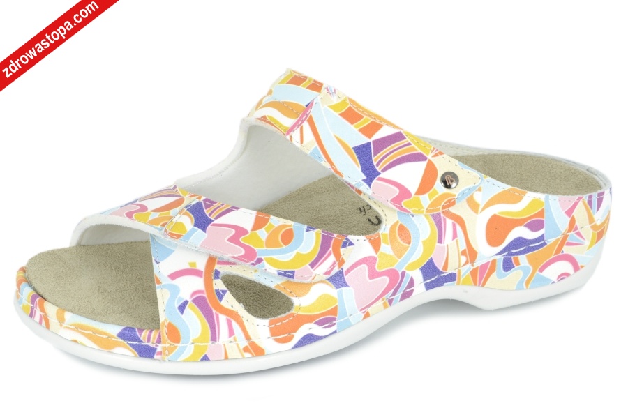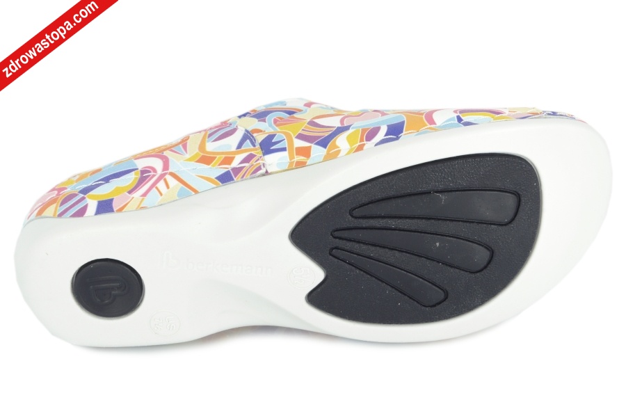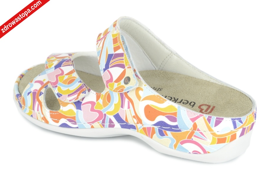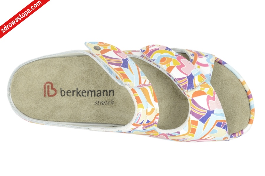 Dodatkowe informacje: Jest to obuwie niemieckiej firmy BERKEMANN istniejącej od 1885 roku z linii BERKOFLEX. Posiadają bardzo dobrze wyprofilowane wkładki wymienne przystosowane do prania. Wyścielone skórą garbowania roślinnego. Oryginalna pięciofazowa wkładka w podeszwie wewnętrznej oraz zapięcia na 2 rzepy zapewniają wiele możliwości regulacji. Sprawiają, że obuwie dobrze trzyma się na nodze i zapewnia najwyższy komfort noszenia. Dzięki wyjmowanej wkładce można stosować zamiennie wkładki ortopedyczne. Na wysokości haluksa klapek wykonany z materiału streczowego co dają duży komfort na obolałe wypukłości. Podeszwa lekka elastyczna nie ślizgająca się.