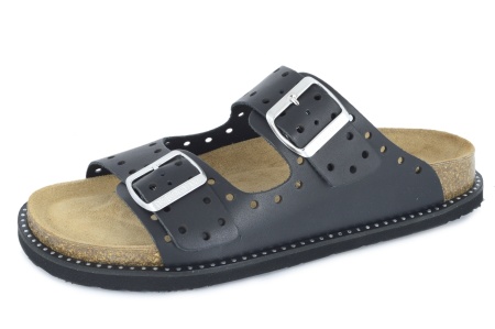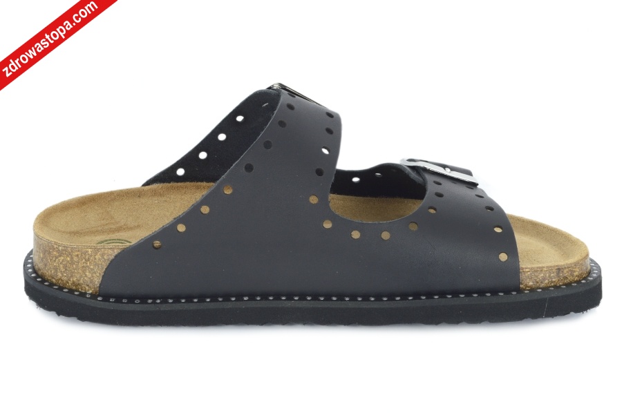 Dodatkowe informacje: cholewka skórzana, wyprofilowane ortopedyczne klapki regulowane na dwa paski z klamerką.