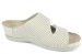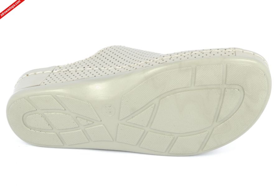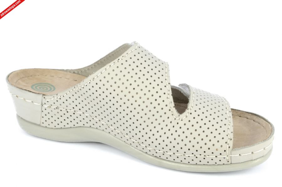 Dodatkowe informacje: wyprofilowane klapki damskie, skórzane, z punktem na pięcie amortyzującym drgania, dwa regulowane rzepy, w kolorze jasno beżowym
