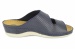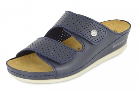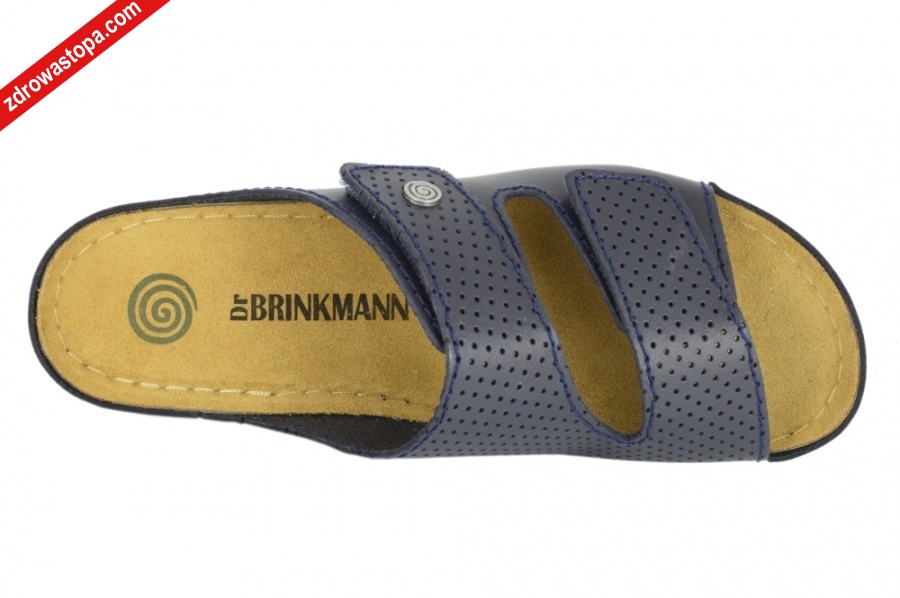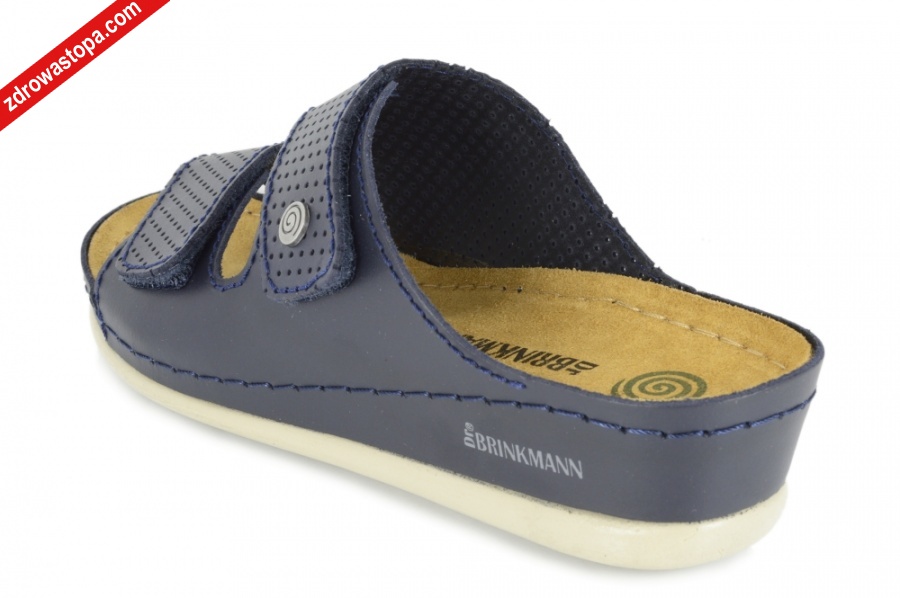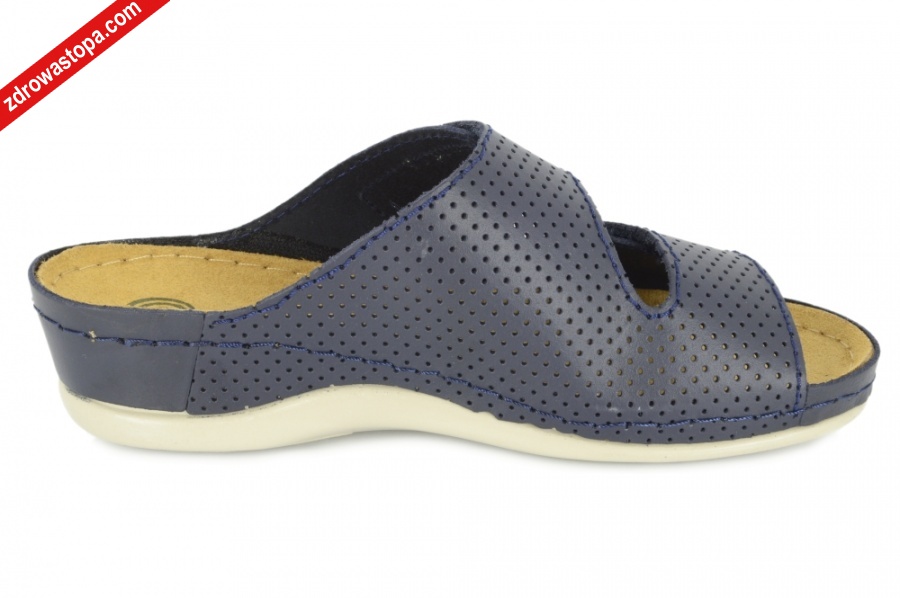 Dodatkowe informacje: wyprofilowane klapki damskie w kolorze granatowym, skóra perforowana zapewnia dobrą wentylację stopy, z punktem na pięcie amortyzującym drgania, zapinane na dwie rzepy.