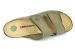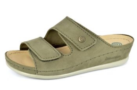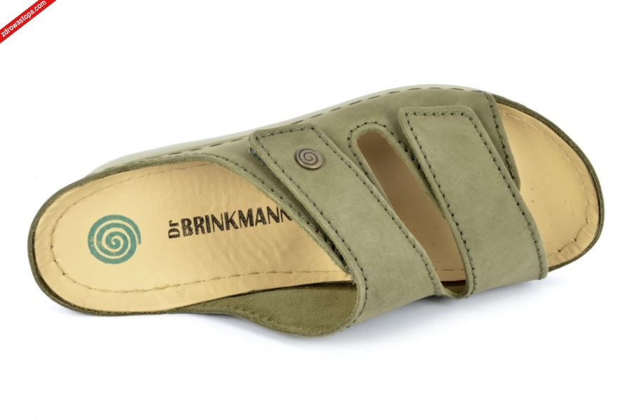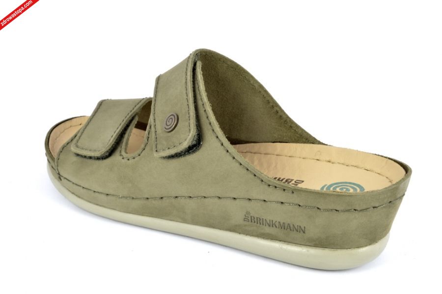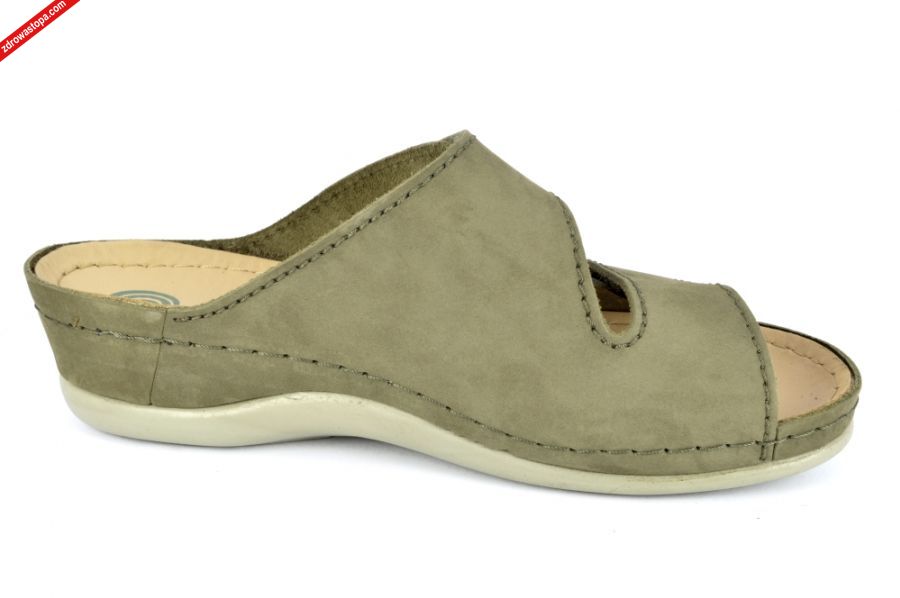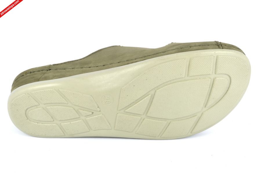Dodatkowe informacje: wyprofilowane klapki damskie w kolorze olivkowym, skórzane, z punktem na pięcie amortyzującym drgania, zapinane na dwa rzepy.
