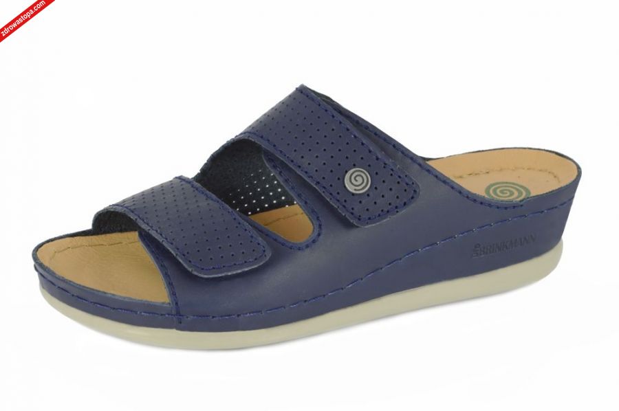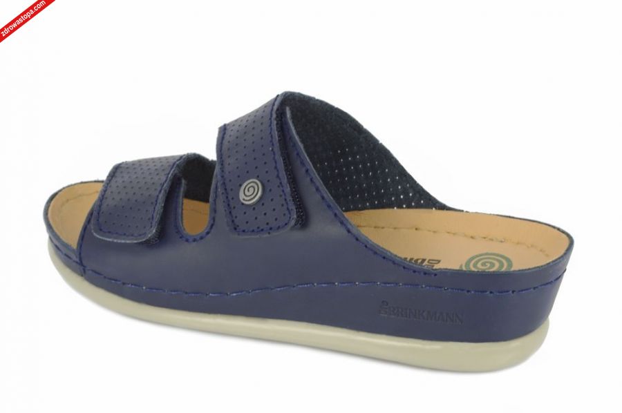 Dodatkowe informacje: wyprofilowane klapki damskie w kolorze granatowym, skóra perforowana zapewnia dobrą wentylację stopy, z punktem na pięcie amortyzującym drgania, zapinane na dwie rzepy.
