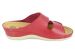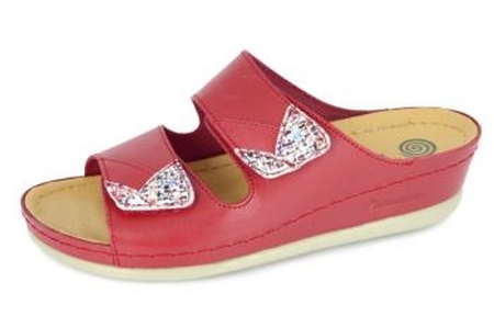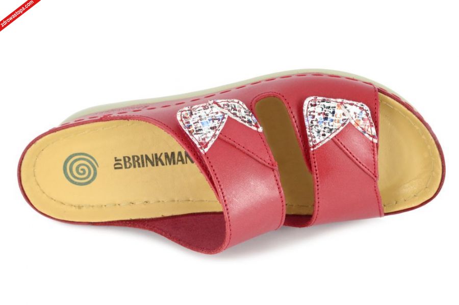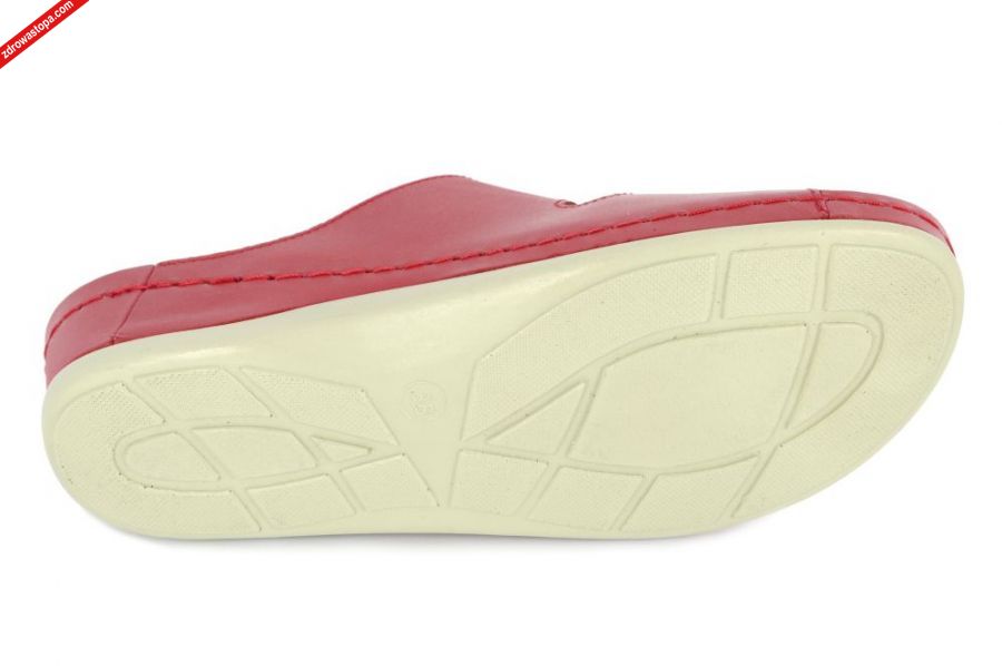 Dodatkowe informacje: wyprofilowane klapki damskie, skórzane, z punktem na pięcie amortyzującym drgania, zapinane na dwie rzepy.
