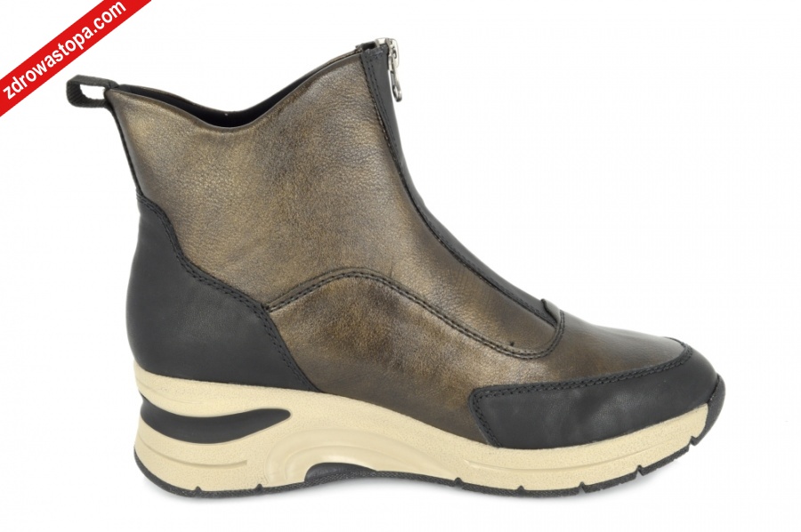 Dodatkowe informacje: Najnowsza kolekcja botka damskiego firmy RIEKER, model bardzo łatwo wsuwalny dzięki zapięciu na suwak. Miękka, wyjmowana wkładka. wysokość klinu 60mm, spody elastyczne i antypoślizgowe.