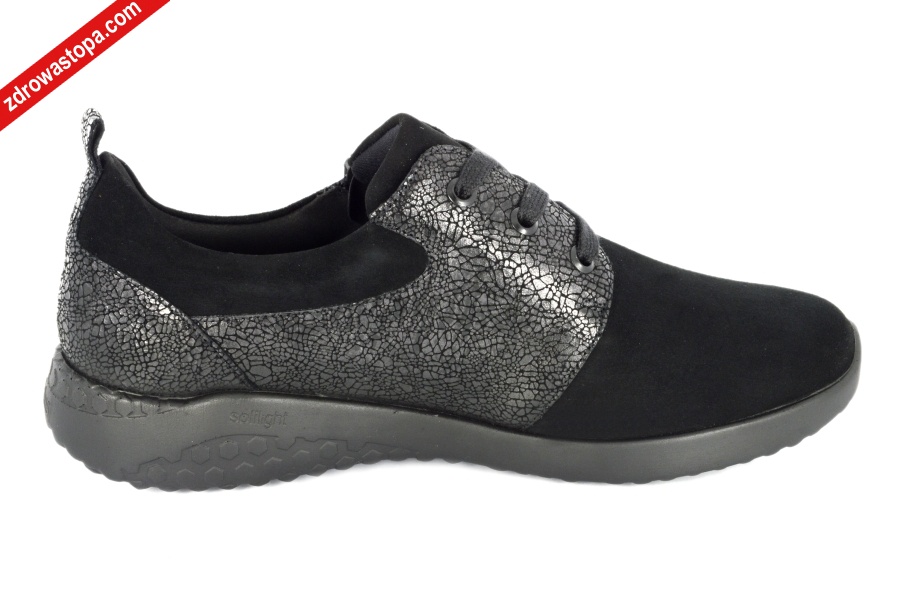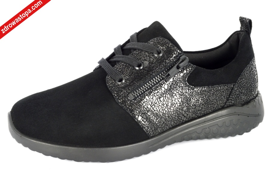 Przednia cześć wykonana w technologii LEATHER STRETCH - naturalna skóra jest podszyta rozciągliwym materiałem dzięki czemu stopa nie jest uciskana i dopasowana do kształtu stopy. Sznurówki pozwalają ca idealne dopasowanie do stopy, suwak z boku ułatwia zakładanie. Wysokość podwyższenia pięty 30 mm. Wyjmowana wkładka. Lekkie i elastyczne spody amortyzujące drgania.