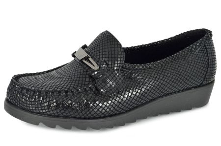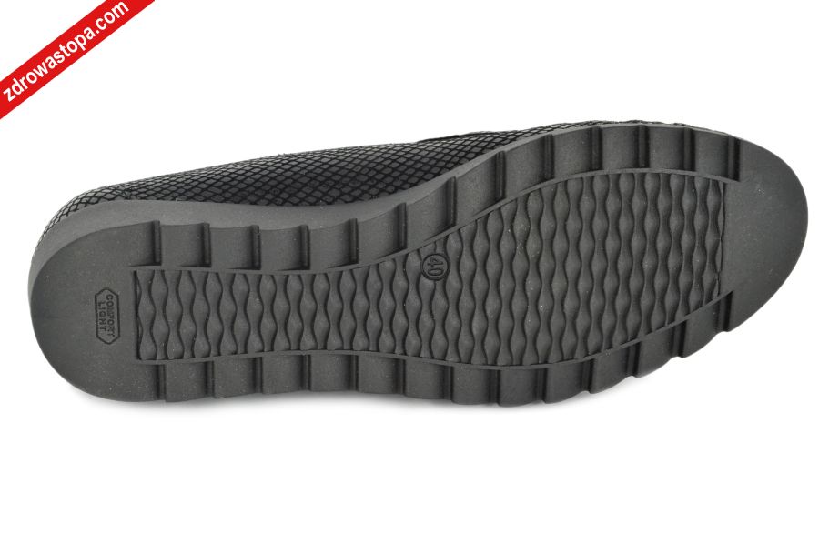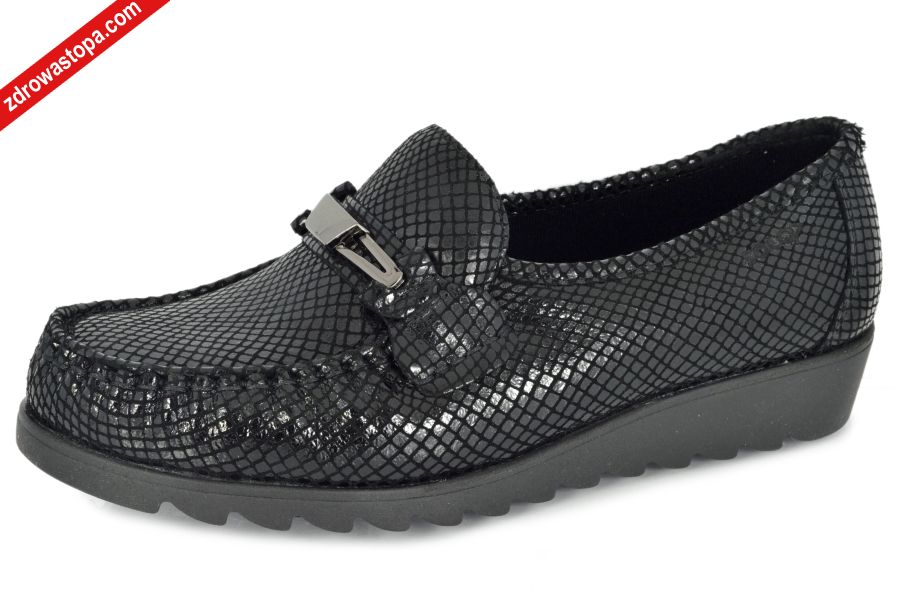 Dodatkowe informacje: klasyczny półbut skórzany firmy SOLO, bardzo miękka skóra w kolorze czarnym o podwyższonej tęgości H, wsuwane, wysokość klinu 30 mm. Wkładki pokryte płynem dezynfekującym z dodatkiem srebra koloidalnego, eliminuje bakterie, wirusy i grzyby. Lekkie i elastyczne spody