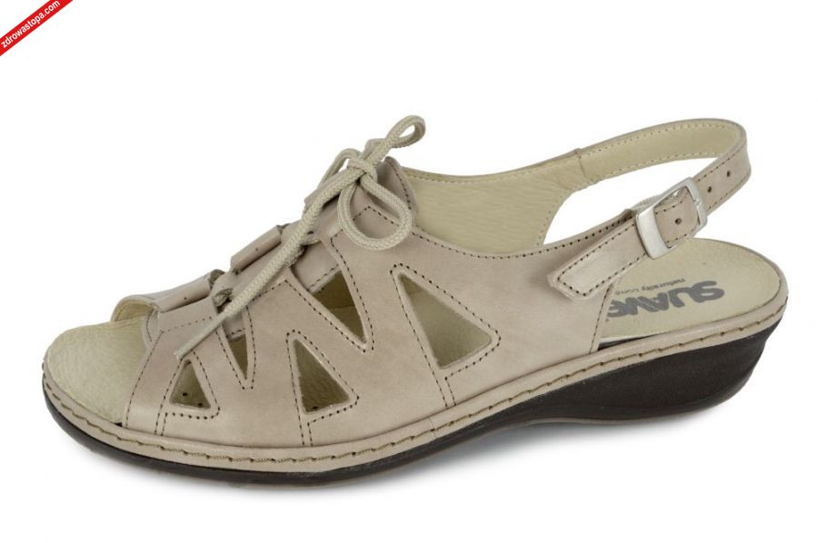 Dodatkowe informacje: wysokość klinu: 35 mm. Tęgość regulowana sznurówką. Zapinane na pasek z klamerką. Wyjmowana skórzana wkładka. Elastyczne i antypoślizgowe podeszwy.