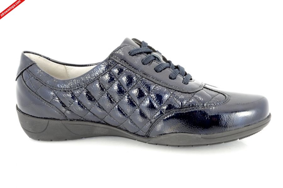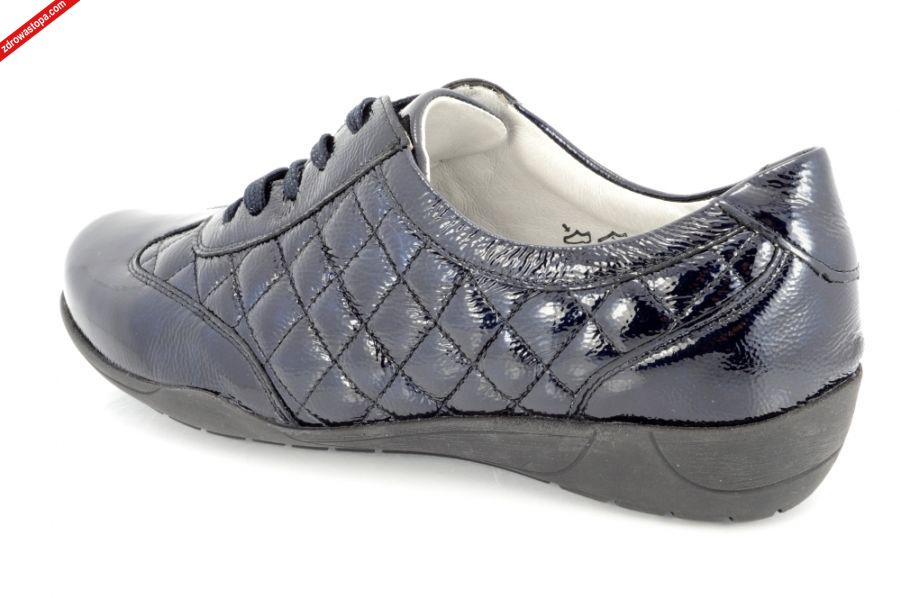 Dodatkowe informacje: Bardzo duża tęgość M przeznaczona jest dla Pań z dużym haluksem i wysokim podbiciem. Wyjmowana wkładka daje możliwość wymiany na własną wkładkę ortopedyczną. Buty wykonane z bardzo miękkiej pikowanej skóry lakierowanej, co zapewnia wysoki komfort użytkowania. Solidna podeszwa amortyzuje mikro-wstrząsy.