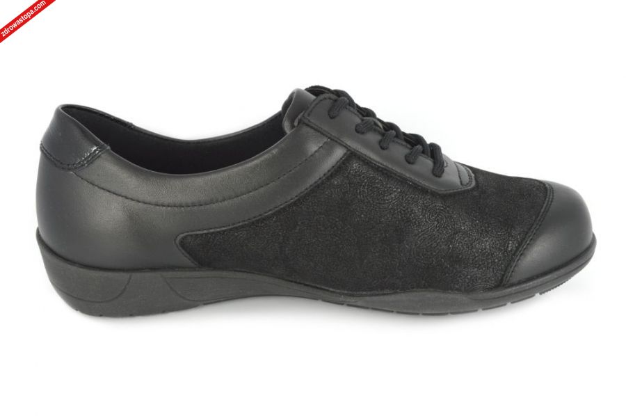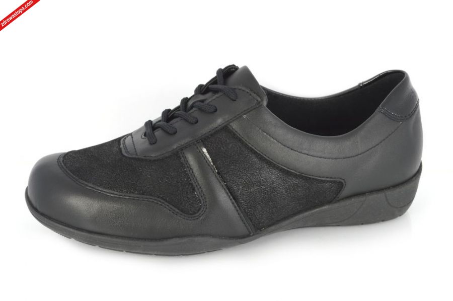 Dodatkowe informacje: Bardzo duża tęgość M przeznaczona jest dla Pań z dużym haluksem i wysokim podbiciem. Wyjmowana wkładka daje możliwość wymiany na własną wkładkę ortopedyczną. Buty wykonane z bardzo miękkiej skóry licowej połączonej ze streczem, zapewniają komfort użytkowania. Solidna podeszwa amortyzuje mikro - wstrząsy.